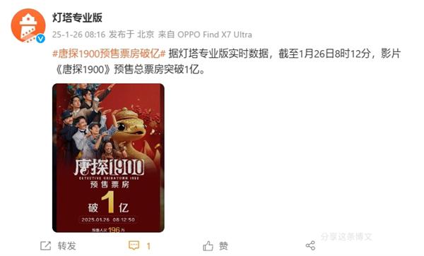 快科技 1 月 26 每日新闻,根据灯塔专业版的实时动态,截至 1 月 26 日 8 时 12 电影《唐探》分 预购总票房突破1900 1 亿,将在大年初一(1 月 29 日)上映。