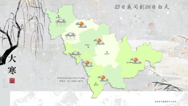 二十五日夜至二十六日白天,全省晴转多云,白城、松原南部、四平有小雪。