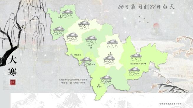 26日晚至27日白天,全省阴天,白城南部、松原南部、四平、辽源、吉林南部、通化、白山、延边南部、长白山保护开发区下雪,部分地区下雪,白城北部、松原北部、长春下雪,其他地区下雪。