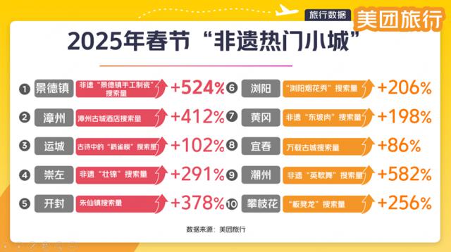 根据美团旅游数据,2025 年 1 从月中旬开始,国家非物质文化遗产“景德镇手工制瓷”的搜索量同比增长。 推动景德镇春节期间文化旅游订单明显上升的524%。