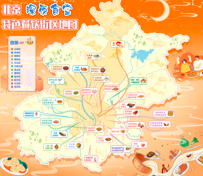 比如在北京,在美食贺春系列活动中,不仅与重点餐饮企业联合举办团圆饭榜单评比、“春节美食汇”等活动,还专门推出了北京商业消费空间地图和北京深夜食堂特色餐饮街区地图“京彩乐购”。