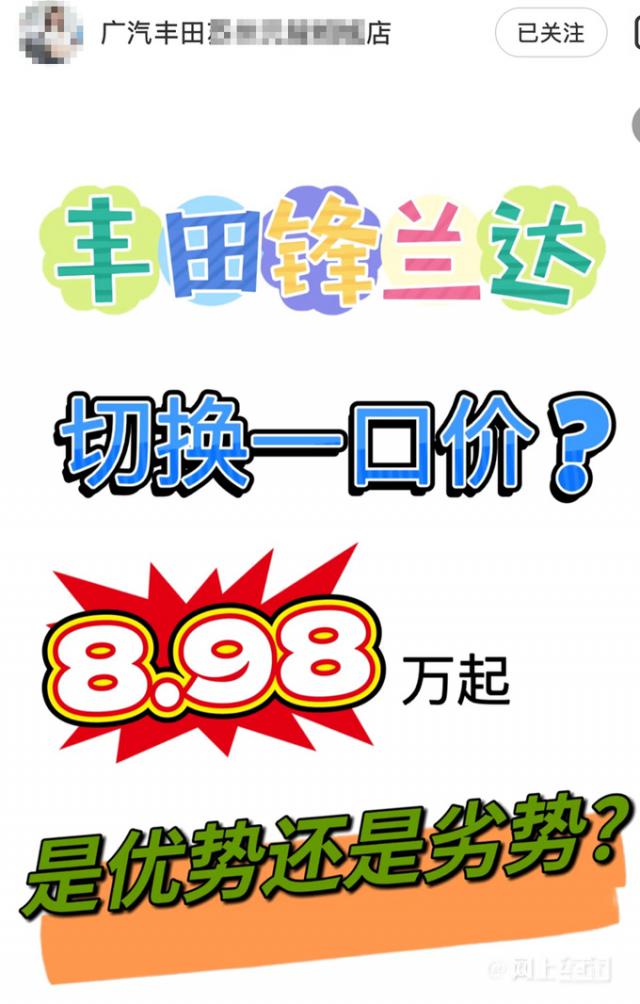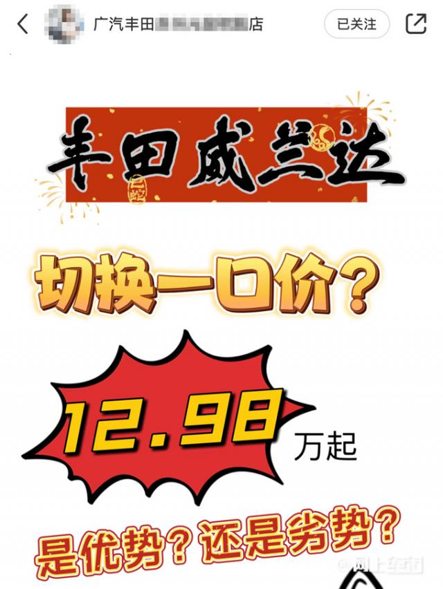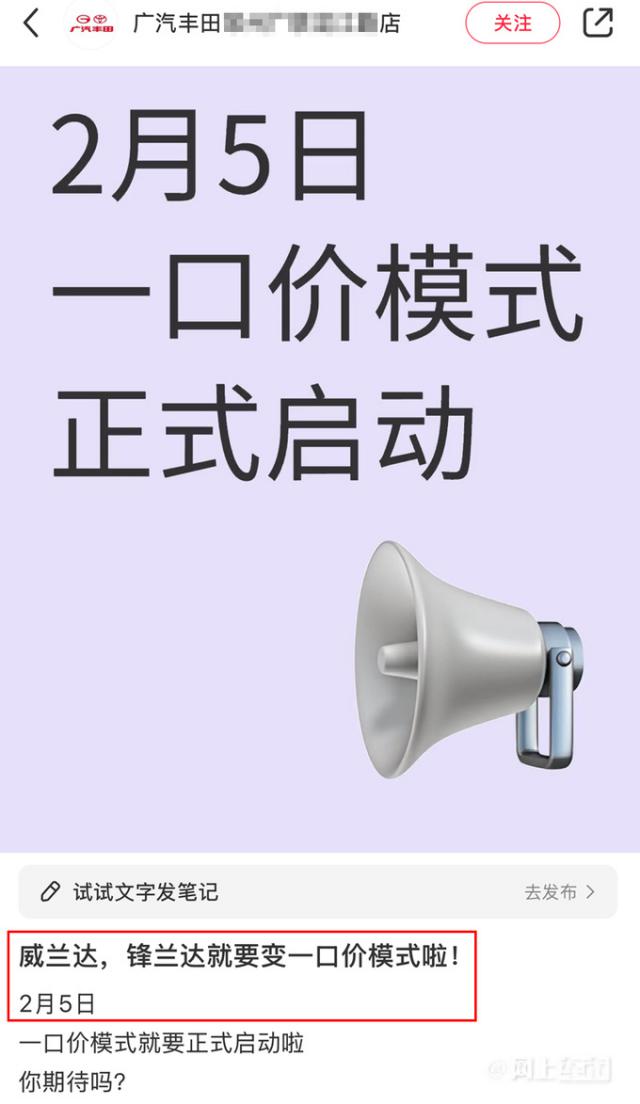 最近广汽丰田要打开一口价格的方式,在社交平台上传开了!2 月 5 从数字开始,威兰达、锋兰达都将遵循这一模式。