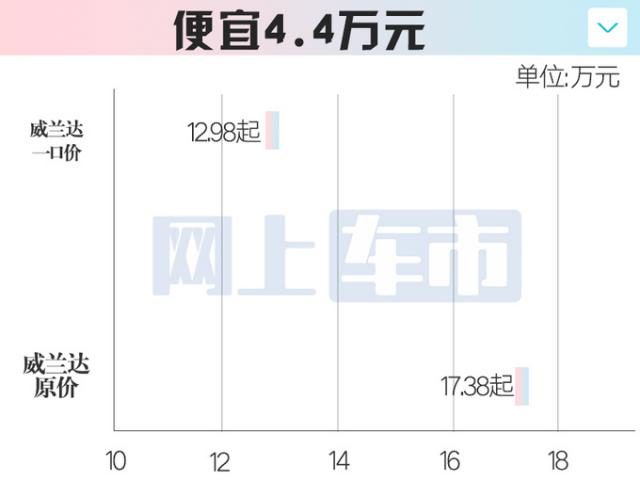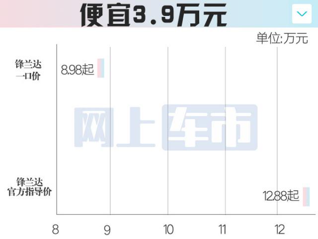 威兰达原价 17.38 万元起,转换一口价后只要转换一口价格。 12.98 万元起,降了 4.4 一万元;锋兰达原价 12.88 万元起,一口价只需要 8.98 一万元起,便宜 3.9 万元。