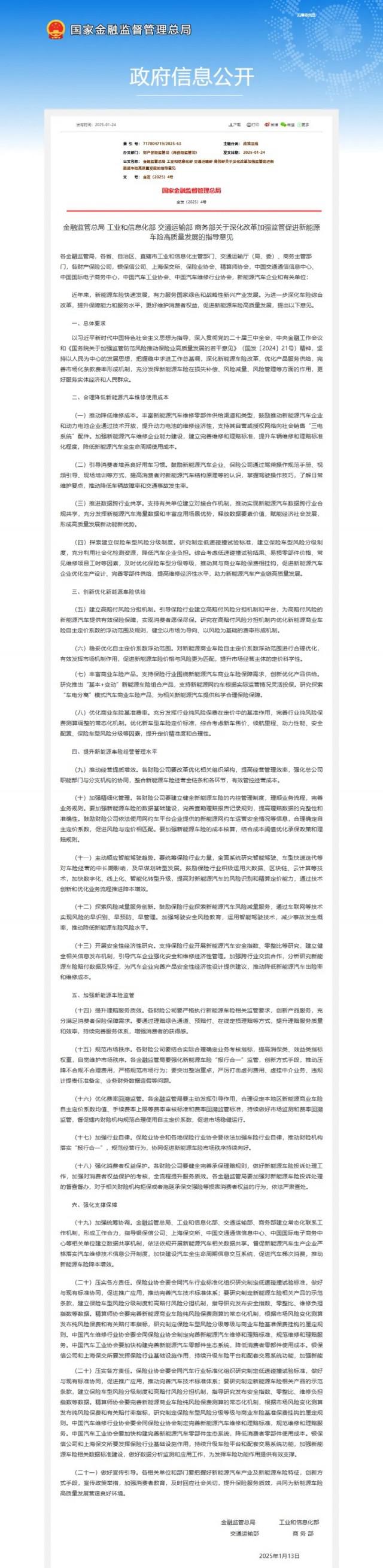 近日,金融监管总局、工业和信息化部、交通运输部、商务部发布《关于深化改革、加强监管、促进新能源汽车保险高质量发展的指导意见》(以下简称《指导意见》)。