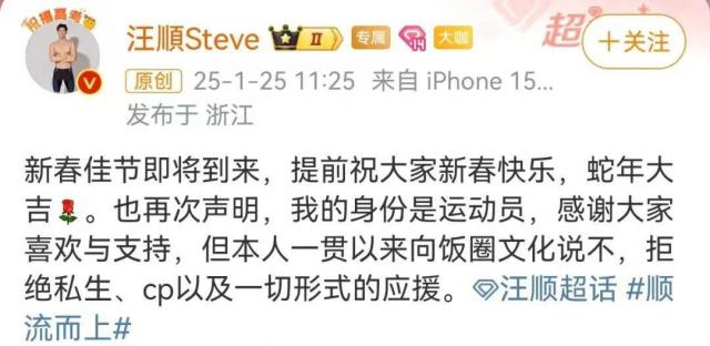 1 月 25 日本,奥运冠军、浙江籍游泳运动员汪顺,在个人社交平台上发文,拒绝饭圈文化。
