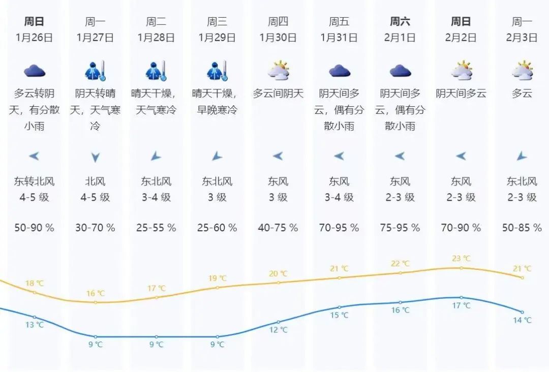 一月二十六日,多云转阴,小雨分散,气温13℃-18℃。;东风4-5 等级;50-90的相对湿度 %。