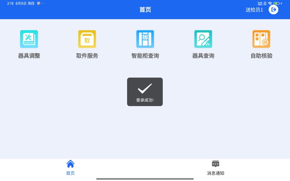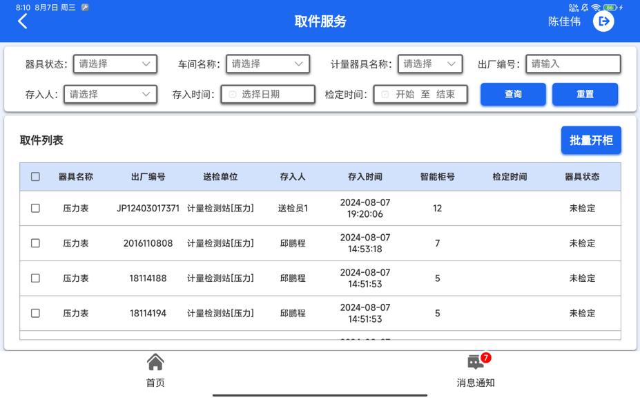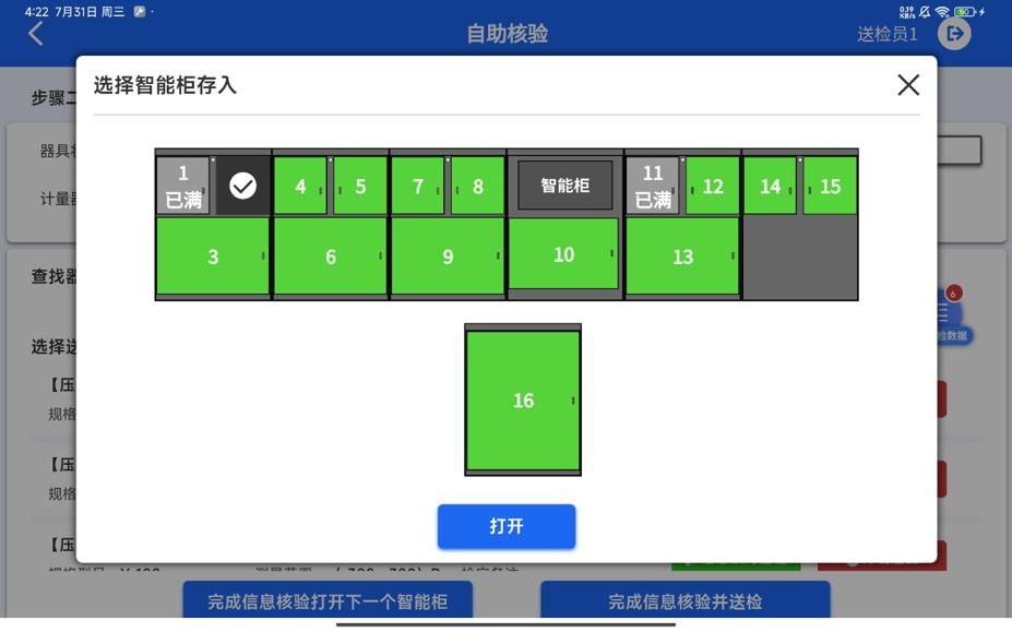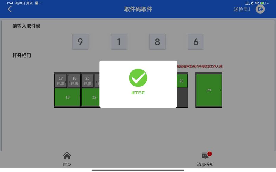 计量员提交仪器检验计划后,在智能屏幕提示下打开柜门,将检验仪器放入接收柜中。检验员收到检验信息后,可以根据石化通提醒将接收柜中的仪器收回检验。