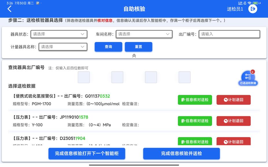 检验过程中,检验员通过操作界面查看待检验仪器的详细信息,包括仪器类型、规格、检验时间等。,从而为检验工作提供全面的数据支持。检验结束后,系统会自动更新仪器状态,并将检验结果实时反馈给检验部门,确保信息的及时性和准确性。