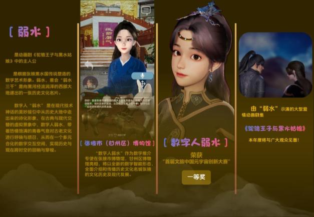 我拿弱水,意思是“弱水3000”。它是黑河西部土地的历史文化名片。它源于动画剧《骆驼王子与黑水女孩》中的主人公。它是根据张掖市甘州区黑水国传说精心塑造的数字艺术形象,也是从历史地面走出来的诗意形象,在现代技术和神话的精彩接引下获得“第一届文化旅游中国元宇宙创新大赛”一等奖。