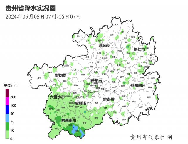 ▲图 1 2024 年 5 月 5 日 7 时至 6 日 7 贵州省降雨实况图