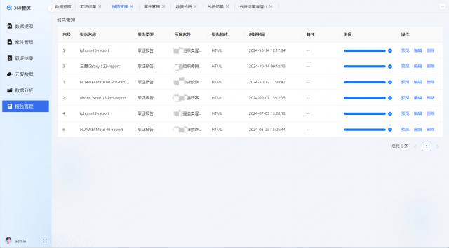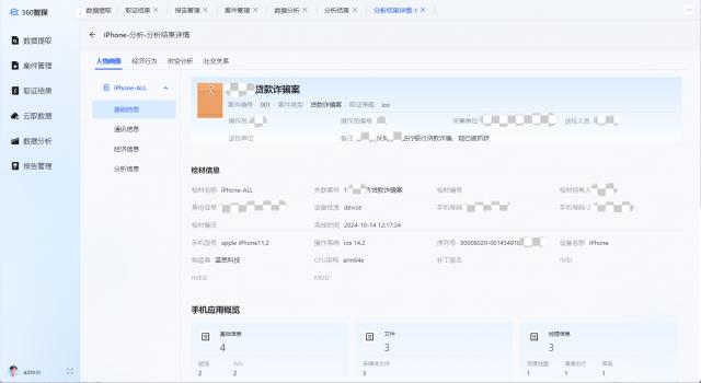 基于 360 这个系统可以对手机进行智能分析,一键导出报告,具备手机破解、数据修复等多样化能力。,从而全面提取和深入挖掘电子数据线索,帮助提高办案过程中的侦察效率,如关联冲击、数据判断、案件关联和线索挖掘。