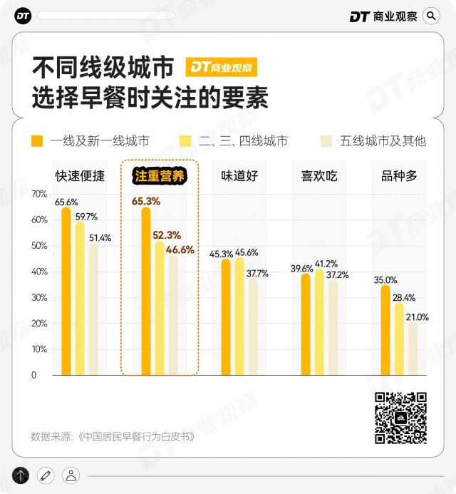 但幸运的是,越来越多的人从“全面关注和管理自己的健康”的趋势中意识到早餐的重要性,忙碌的生活中,增加了对自己健康更加细致的需求。根据《中国居民早餐行为白皮书》,在一线城市和新一线城市,人们在选择早餐时,“注重营养”和“多品种”的比例正在上升。