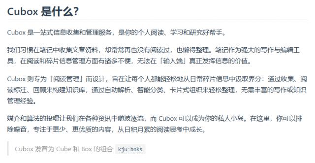 根据它的网站介绍,Cubox 它是一站式信息收集和管理服务,是您个人阅读、学习和研究的好助手。的确,我在实践中感觉很好,很实用。我也在知识星球推荐过这个软件。
