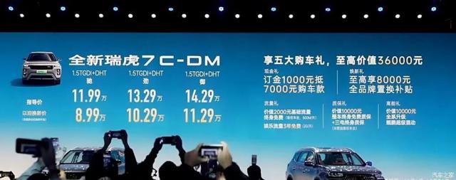 11 月 1 日本,新奇瑞瑞虎 7 PLUS和瑞虎 7 高能量版正式上市。其中瑞虎 7 PLUS 共推出 4 款车,售价 9.99-12.99 万元,瑞虎 7 高能版推出 4 款车,售价 10.79-13.99 一万元,买车享受定金 1000 元抵 10000 元购车款,无上享受 10000 元全品牌置换补贴。瑞虎 7 C-DM 推出 3 款车,售价 11.99-14.29 一万元,买车享受定金 1000 元抵 7000 元购车款,无上 8000 元全品牌置换补贴。