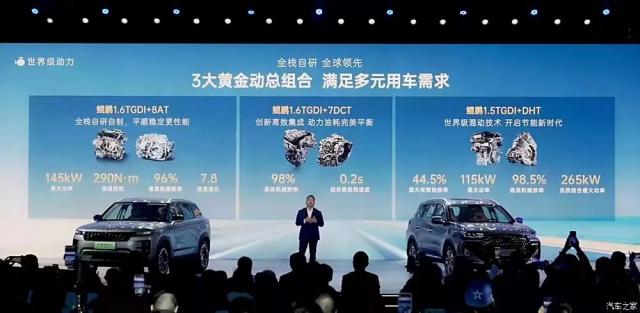 动力方面,新车提供 1.6T 8AT 或 1.6T 7DCT 两个动力总成,这个 1.6TGDI 发动机的最大功率是 峰值扭矩,145kW 290N · m,WLTC 百公里油耗 7.09L。根据型号的不同,各自匹配。 8 速手自动变速箱和 7 湿式双离合变速箱。