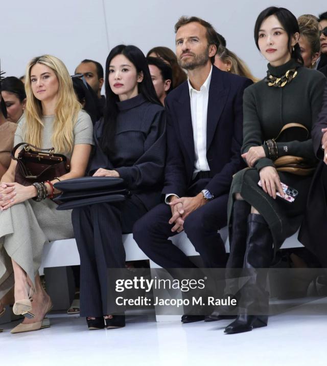 在秀场上,唐嫣还与韩国女演员宋慧乔同框,两人年龄相仿的颜值和状态都在线,各有各的美。