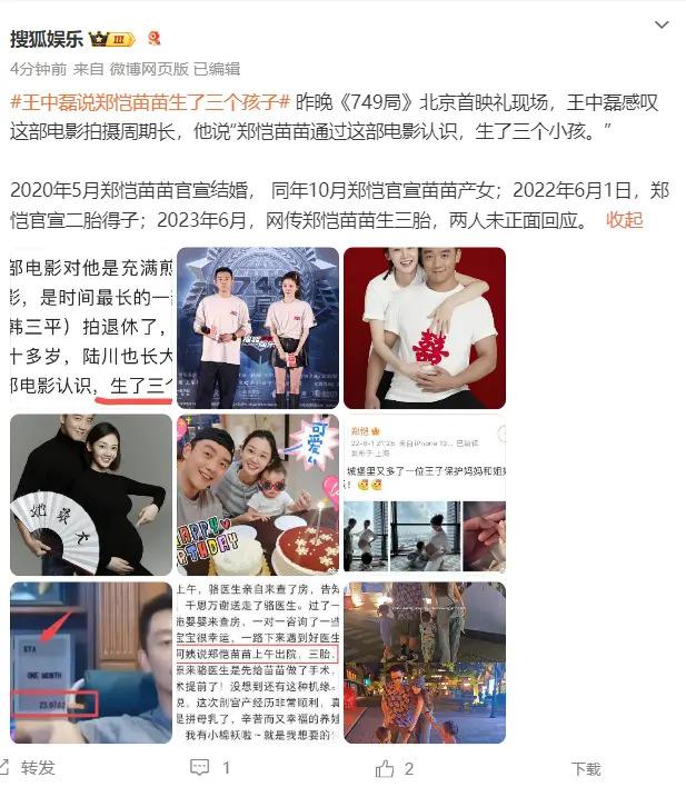 9 月 29 日,影片《749 该局的首映式在北京举行,“华谊”老板王中磊突然爆料,郑恺和苗苗通过这部电影相识,两人相识。 3 一个孩子,第一次公开苗苗抱三的事实。