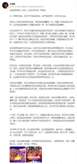 12 月 19 日晚,前国足队长、广州队功勋冯潇霆社发长文,他要正式跟大家说再见!他要正式和大家说再见了!