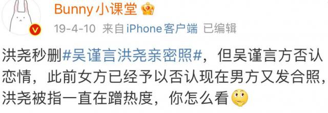 2个月以后,19 年 4 月份,洪尧不知道是手滑还是什么,在微博上, po 张和吴谨言贴了一张亲密照。