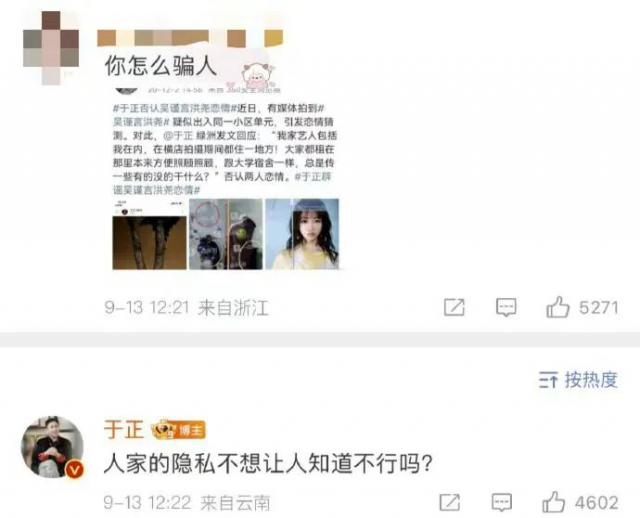 由于今天吴谨言和洪尧公开后,有网友去评论区问于正同是否同意?
