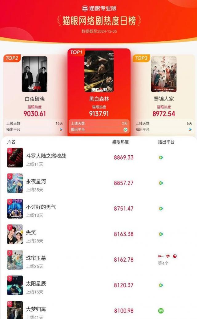 猫眼睛的热值更高 成网剧热度榜9137.91 TOP1。