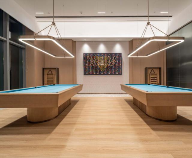 比如氧气书店搭配暖色实木色,辅以盆栽和绿色植物,配有书柜、书籍和沙发展台,营造出平静温馨的阅读环境;台球室配有个性化静音地板,租户在不影响他人的情况下享受桌球的乐趣;健身房还配备了包括有氧设备区、固定设备区、自由力量设备区、私人教育区、瑜伽和团体操作区在内的健身房。严格按照大型专业健身房量身定做。