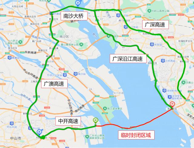 (2)深圳向中山方向:广深沿江高速或广深高速-南沙大桥-广澳高速-中开高速。