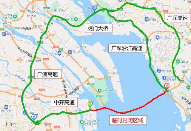 (2)深圳向中山方向:广深沿江高速或广深高速-虎门大桥-广澳高速-中开高速。