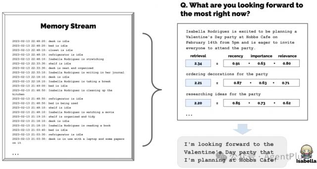 记忆流:首先,论文描述了一个叫做记忆流的长期记忆模块,它以自然语言的形式记录了代理人的所有经历。记忆对象包括自然语言描述、建立时间戳和最新访问时间戳。