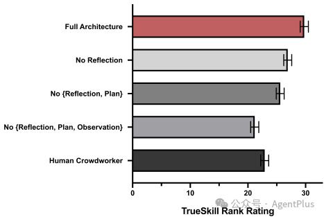可控性评估:在可控性评估中,论文通过“访谈”代理来测试其在自我认知、记忆、计划、反应和反思方面的优势。结果表明,完整的代理结构产生的行为是最可靠的,删除某一部分后性能会下降。