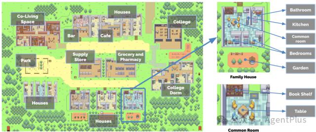 环境:沙盒环境称为沙盒环境 Smallville,有一个小镇,包括一个小镇, 25 一个独特的代理人。每一个代理人都有一个简单的精灵头像表示,初始记忆包括一段自然语言描述。