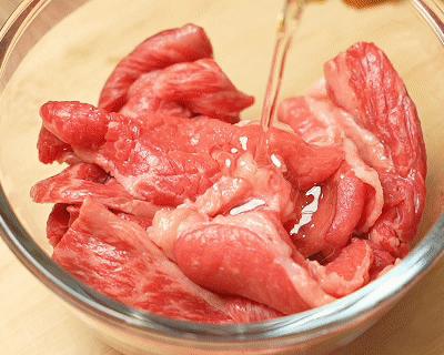 1、将牛里脊切片,加入盐、淀粉、食用油腌制 10-15min