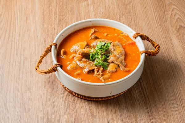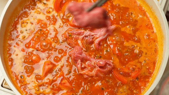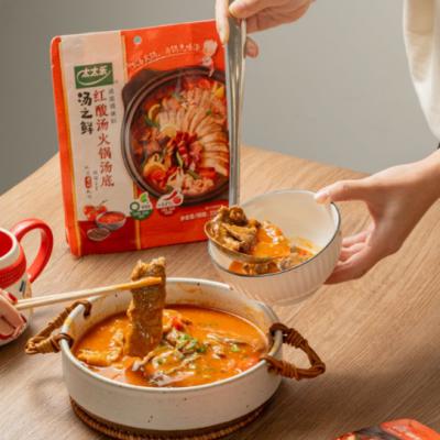 3、再倒入“太太乐”汤鲜火锅汤底调味品(红酸汤味)煮开。