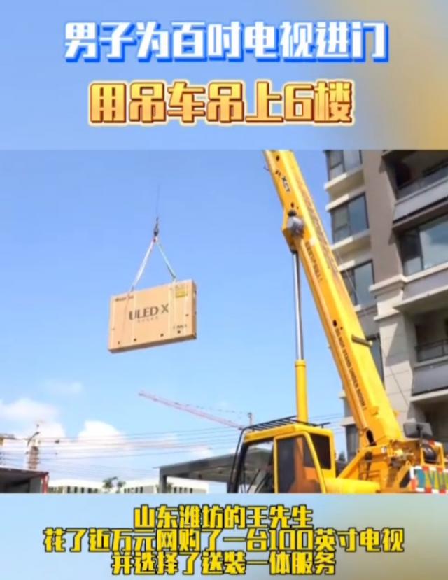 与小型电视不同,百寸电视将涉及拆窗、拆阳台、开吊车吊装电视的情况。