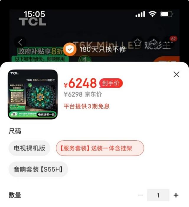 例如一个原价 7299 块的 TCL 85 英尺 Mini LED 电视机,只要所在地区可以使用政府补贴,到手价只要 5839 元,立减 1000 折扣力度,李静终于心动了,选择在京东下单。
