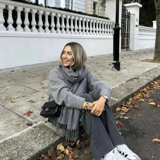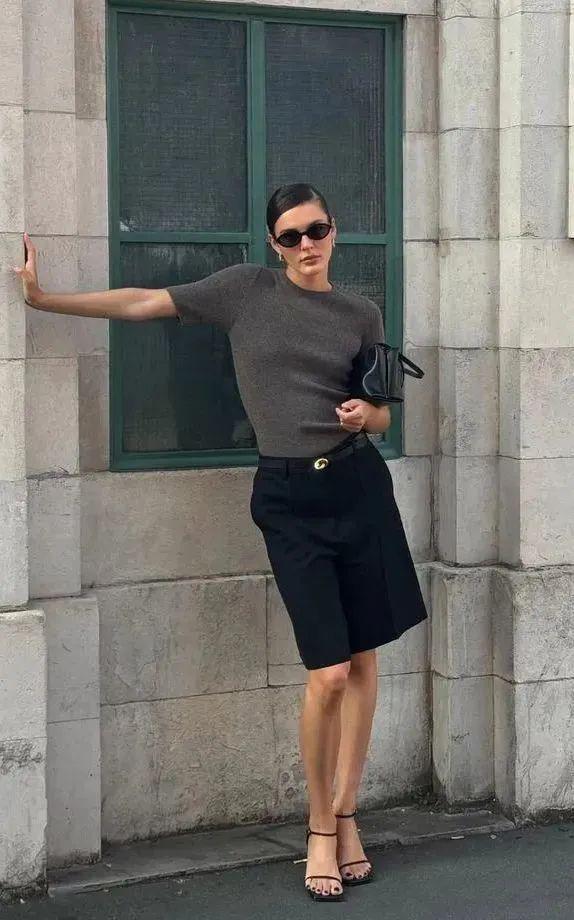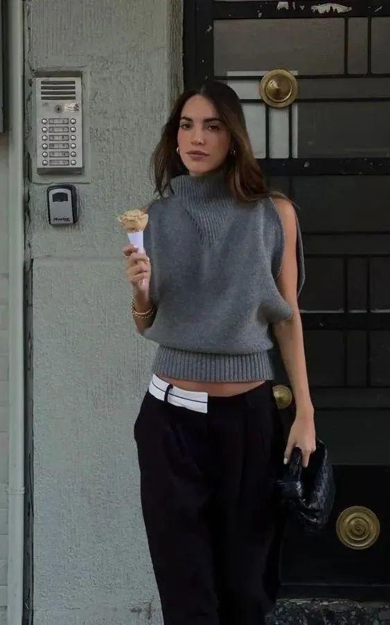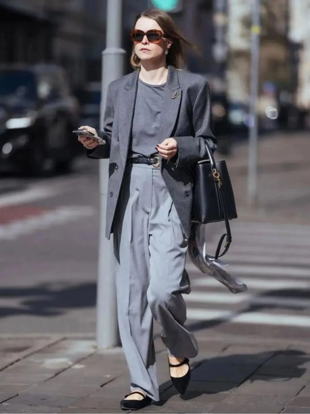 灰色廓形西服,给人一种干练整洁的感觉,内搭黑色短针织衫,则增添了一丝休闲与舒适。