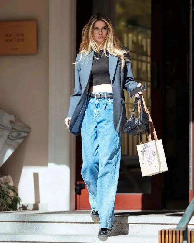 再加上蓝色牛仔阔腿裤,整个造型看起来既有型又不乏休闲。