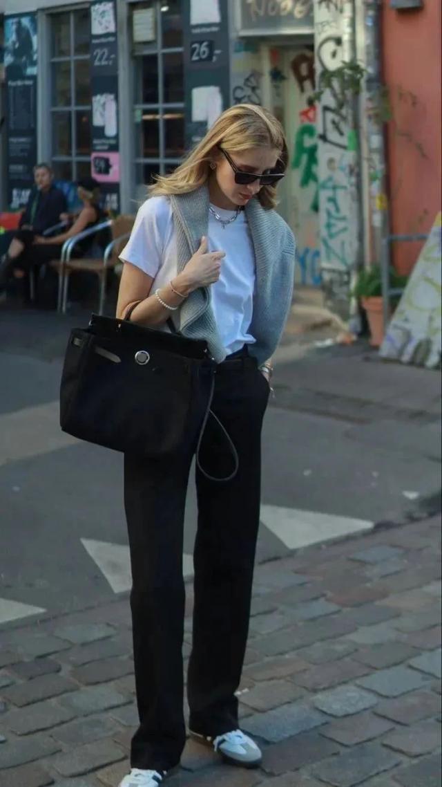 假如早晚气温低,穿简单风白的衣服。 T 恤 黑阔腿裤时,可搭配灰色毛衣披肩装饰。