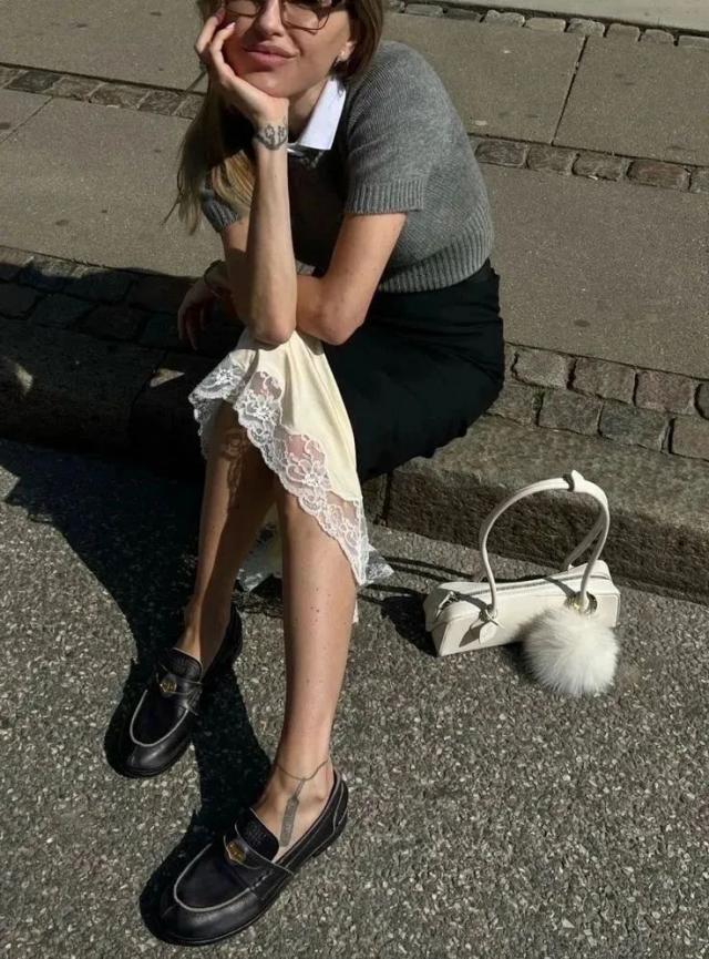 灰短袖针织衫配黑色半裙,再加上裙摆上精致的花边点缀,使整体造型更加别致动人。
