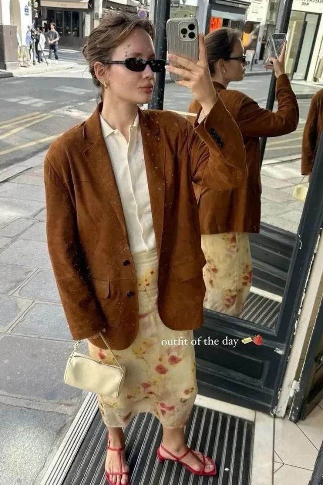 配上杏色衬衣和碎花裙,既时尚又舒适。