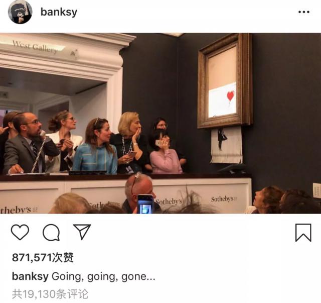结果确实如此。活动结束后,Banksy 在 Instagram 公布了大家围观这幅“被毁一半”作品的图片,并写道“ Going,going,gone …"。" Going,going,gone " 拍卖交易时通常会大喊大叫,“ Gone "表示作品已经出售。
