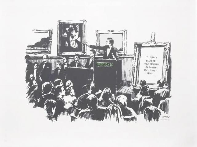 长期以来,Banksy 致力于用各种形式的作品来讽刺艺术界,取笑艺术价格的高低和所谓艺术界的独特性。