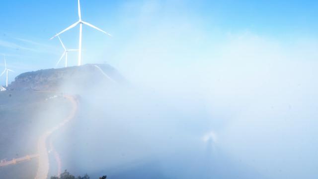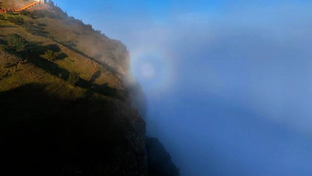 在乌蒙大草原,独特的地理环境和气候条件造就了佛光的出现极佳契机,每一年秋冬季节,当观佛台一带出现云雾时,一旦阳光照射下来,人影投射在云团上,就会反射出以人影为核心的佛光。