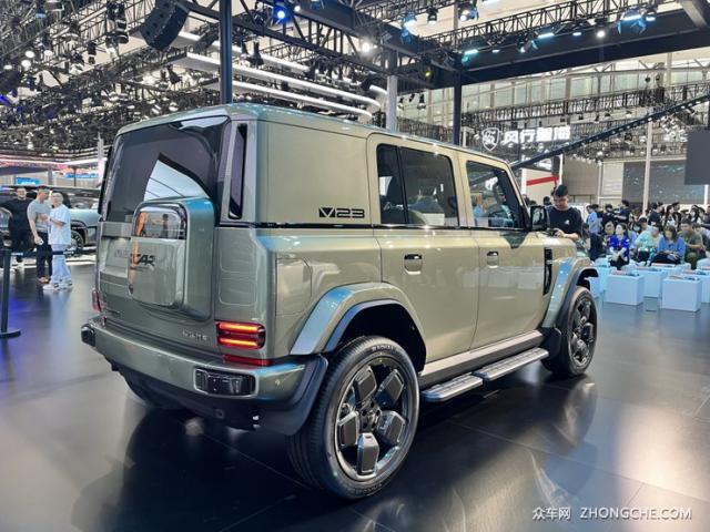 车身侧面采用非常平直的线条设计,充电口位于车辆右后侧,C 在柱子旁边做好了 V23 的字标,C/D 柱子之间有一个封闭的设计,车顶的悬浮式大行李架可以承受 200kg 重量。另外,新车还配有隐藏式门把手、侧踏板和宽大的轮眉,将整车的硬核气息十分直观地呈现出来。