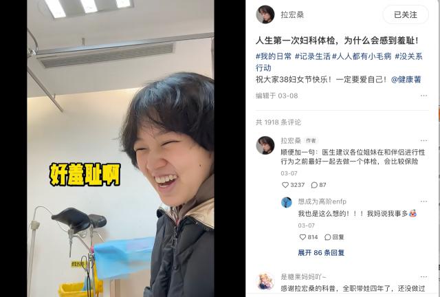 走搞笑风的 @拉宏桑 曾经发布过一段妇科检查视频,引起了很多人的共鸣。图片 / 小红书截图