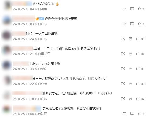 全职高手选择了充分尊重同伴的活力,同时也给予了他们。 IP 线下全覆盖赋能,再掀起“全职热”。从 4 月度全职官方公布 2024 团队城市巡回活动开始,到和和堂,巧乐兹,happyzoo 等待品牌合作,再到杭州地铁 1 在高频、多种活动的吸引下,不同圈子的粉丝重新回归,核心粉丝的热情也点燃了号线主题的闪现和线下多场无人机表演。例如在 8 月底《全职高手》动画第三季大结局上线后,很多粉丝在叶修获得无人机支持的微博下感叹:“全职粉丝怎么会这么浪漫?”、"忍不住想哭啊"。