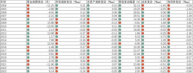 在过去20年中,我们对制造业大类财务数据的变化进行了统计,并以制造业净利率为依据,在经营指标中,保持库存周转率和净利率 17 每年同向变化;营业周期变化(天数越少,资本使用效率越高)和净利率保持 16 每年同向;成本规模(毛利率)和净利率保持 14 每年同向;总资产周转率也有 13 每年同向。