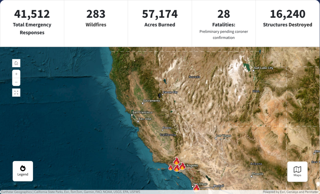 根据加州林业和消防局网站的最新数据,山火至少造成了28人死亡,超过16000栋建筑和222平方公里以上的土地被烧毁。