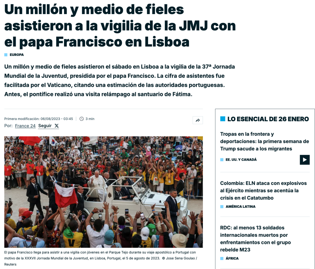 依据法国France 据24电视台报道,当地时间2023年8月1日至6日,第37届世界青年日在葡萄牙首都里斯本举行。5日晚,里斯本特茹公园约有150万天主教青年。(Parque do Tejo)露营,等待第二天教皇方济各主持的闭幕弥撒。