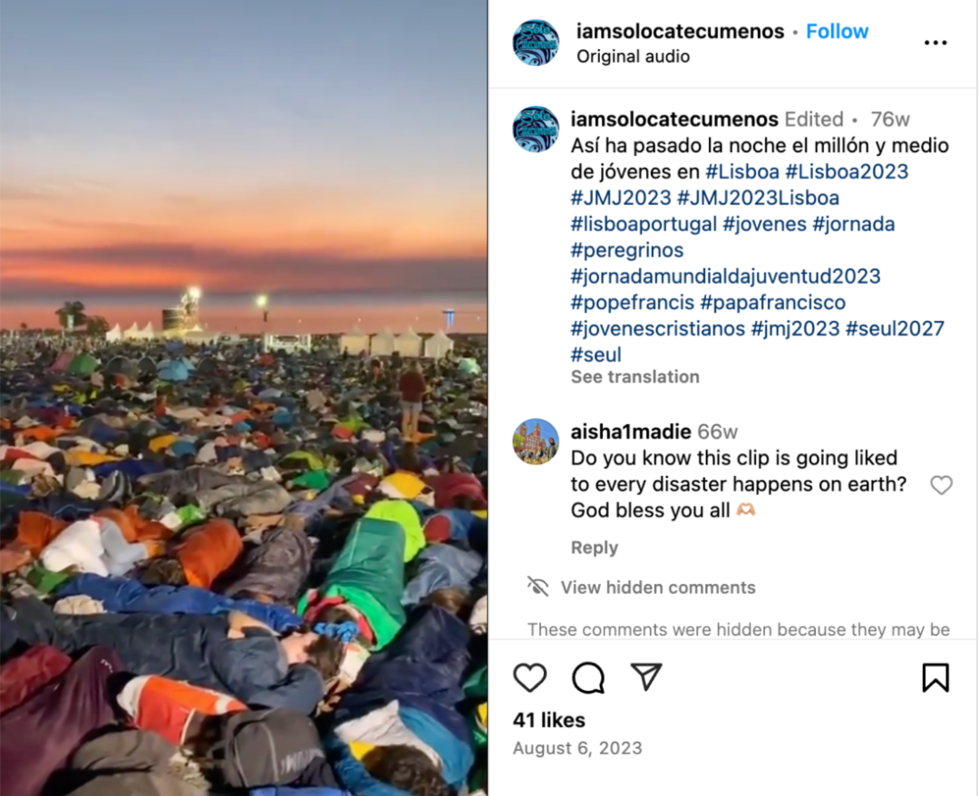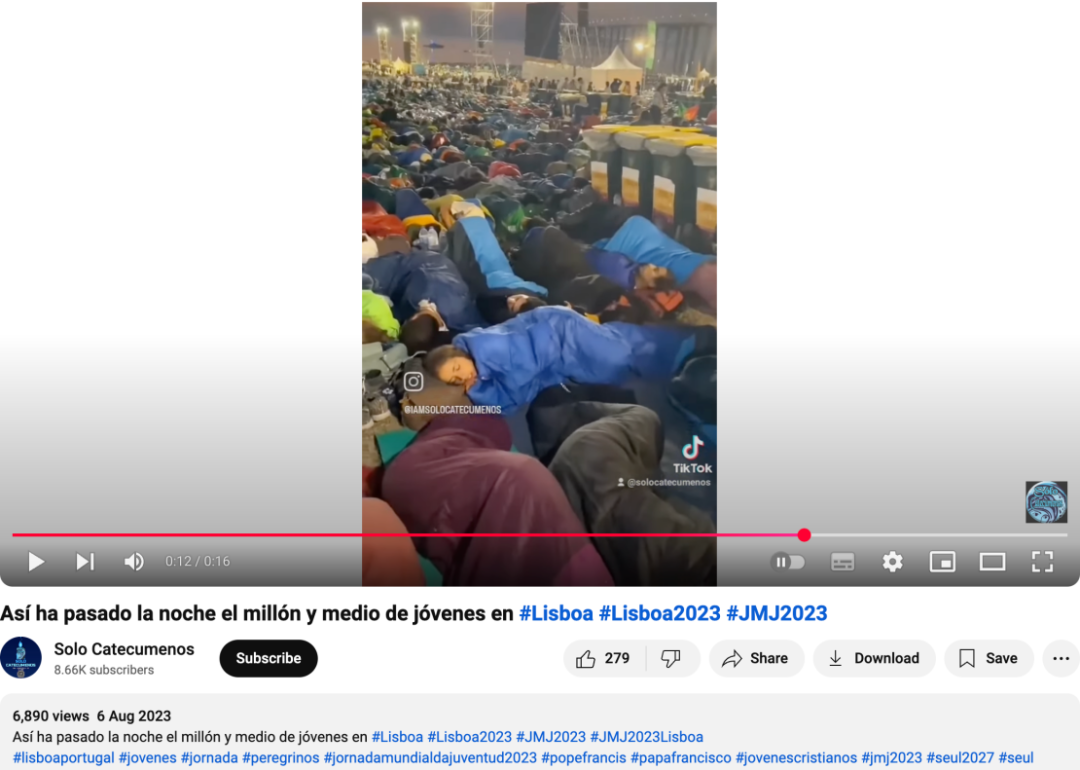 录像显示,“150万年轻人就这样度过了他们的夜晚”,并附上了“里斯本”(Lisboa)“教皇方济各济各济各”“世界青年日2023(ornadamundialdajuventud2023)(papafrancisco)”等标签。